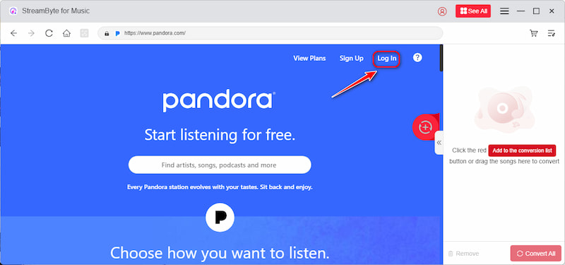 Launch StreamByte for Music and choose the Pandora platform. Then, log into Pandora with your account.